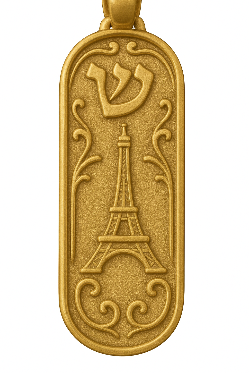 At its center stands the Eiffel Tower, crowned by the sacred Hebrew letter ש (Shin) — a timeless emblem of divine protection and connection to “Shaddai.”